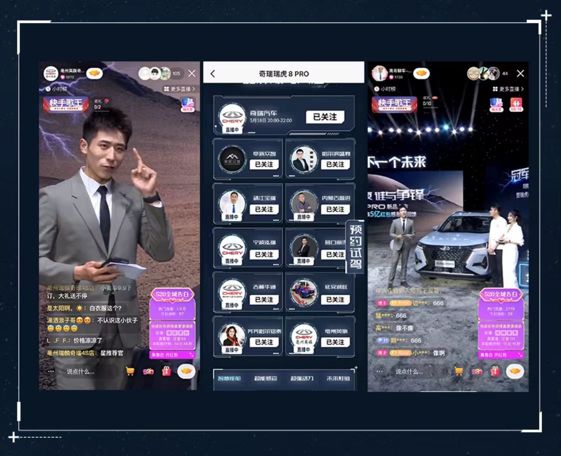 试水的成功开创可被复制的成功模式,2022年,奇瑞汽车联合快手等头部流量媒体平台,打造业内首档现象级汽车直播盛会,全力突破当前困局。5月18日,“冠军之夜,谁与争锋”瑞虎8 PRO新车上市发布会于快手上线,发布会现场运用三体元素打造星球场景,展现瑞虎8 PRO未来科技感,成功打造行业首场沉浸式带货直播。